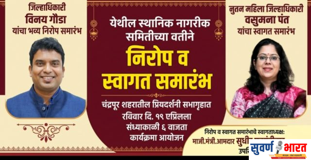 येथील स्थानिक नागरीक समितीच्या वतीने चंद्रपूर शहरातील प्रियदर्शनी सभागृहात रविवार दि.१९ एप्रिलला संध्याकाळी ६ वाजता माजी जिल्हाधिकारी विनय गौडा यांचा भव्य निरोप समारंभ व नुतन महिला जिल्हाधिकारी वसुमना पंत यांचा स्वागत समारंभ आयोजित करण्यात आला आहे.
